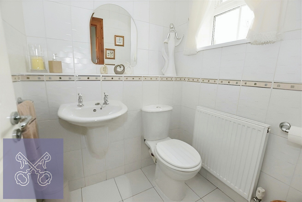 The cloakroom is smartly appointed, featuring a double-glazed window and a two-piece suite in white, comprising a hand basin and a low-flush WC. Extensive tiling on the walls and floor adds a luxurious touch. Ceiling coving and a radiator complete this stylish and functional space.
