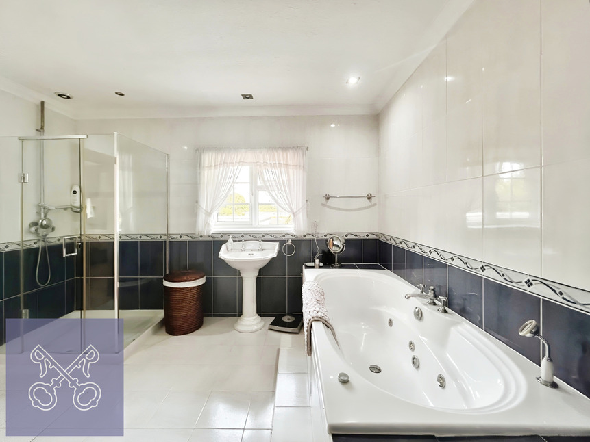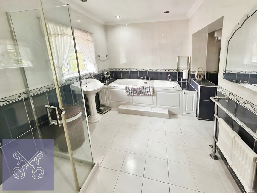 The sizeable en-suite is luxuriously appointed, with a double-glazed window providing ample natural light. It features a quality four-piece suite in white, including a Villeroy Boch spa bath, walk-in shower enclosure with a fitted shower unit, a high-flush WC, and a wash hand basin. Extensive tiling on the walls and floor, along with ceiling coving and spotlights, add a touch of opulence. A nostalgic-style heated towel rail and a built-in storage cupboard further enhance this indulgent space, making it a true sanctuary.