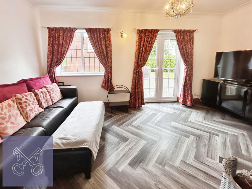 The family room is a versatile space accessed from the kitchen through an open archway. Double-glazed French doors and side windows offer garden views and access, making it a bright and welcoming area. Contemporary floor covering, ceiling coving, a radiator, and a feature display alcove with lighting add to the room’s appeal.