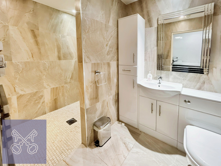 The wet room is a well-appointed space, featuring a walk-in shower area with a fitted Drench shower unit. The wash hand basin is inset into a vanity cabinet that offers ample storage, complemented by an adjacent low-flush WC with a concealed cistern. Extensive tiling on the walls and floor, ceiling spotlights, and a heated towel rail complete this sophisticated and functional space.
