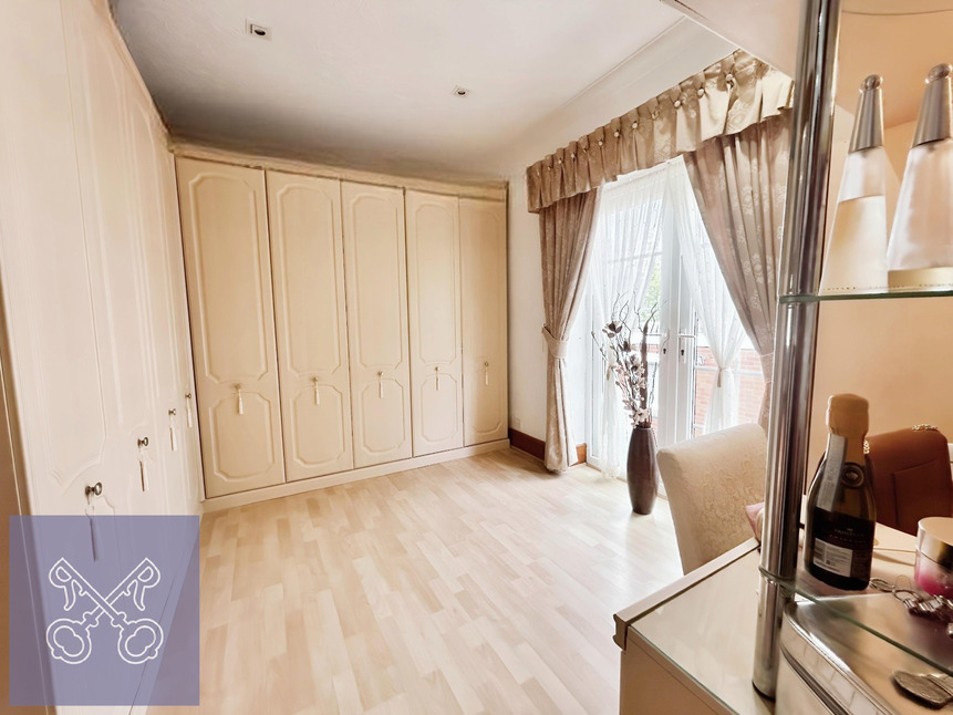 The dressing room is a well arranged space, featuring double-glazed French doors that let in a wealth of natural light. It boasts an array of maple effect furniture, including wardrobes, dressing table, and drawers. Ceiling coving and a laminate floor covering complete the elegant design. A door leads through to the en-suite, ensuring convenience and privacy.