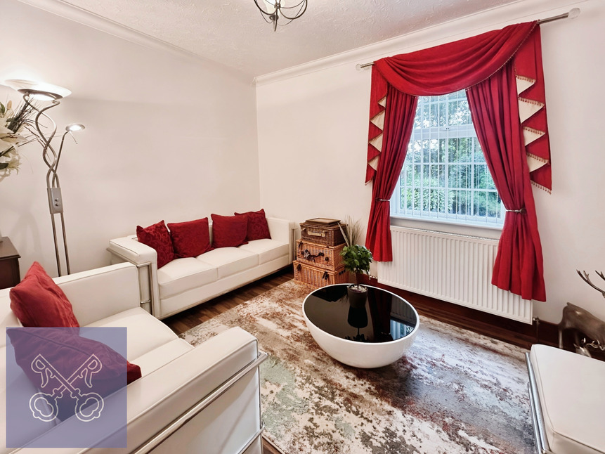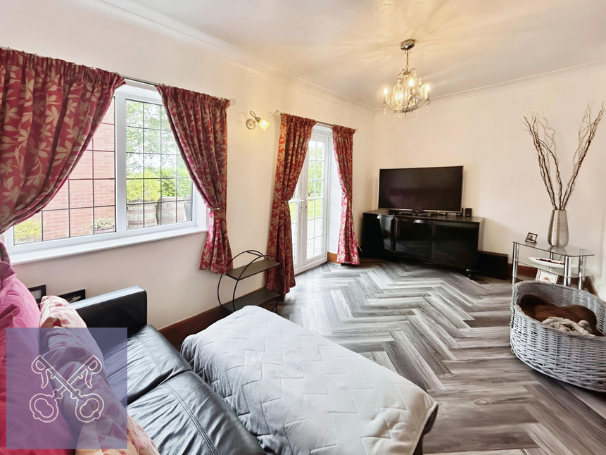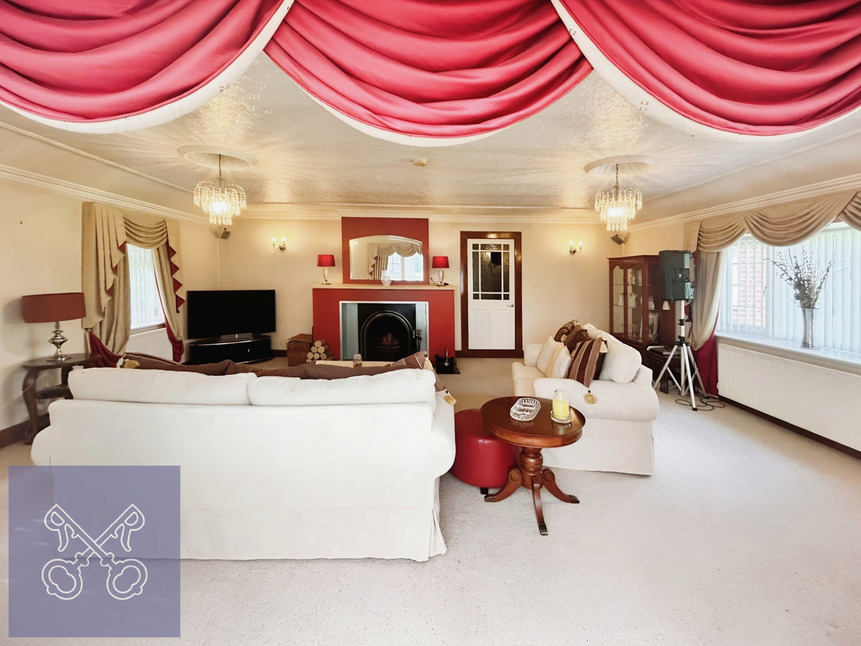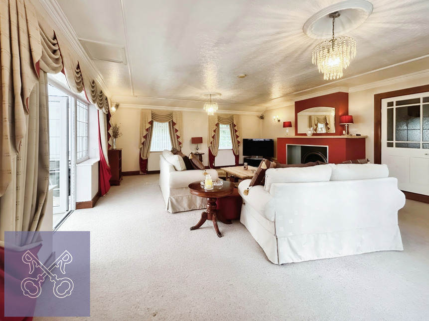 The sitting room is an impressive and spacious area that immediately captures your attention with its elegant proportions. There is ample space to arrange your furniture, including the largest of suites and side tables. The room is centred around a striking feature fireplace with a cast iron insert and complementing surround, perfect for roaring open fires during cooler months. Ceiling coving, two ceiling roses, and three radiators enhance the ambiance, while large windows on multiple sides and French doors offer lovely views and seamless access to the conservatory.
