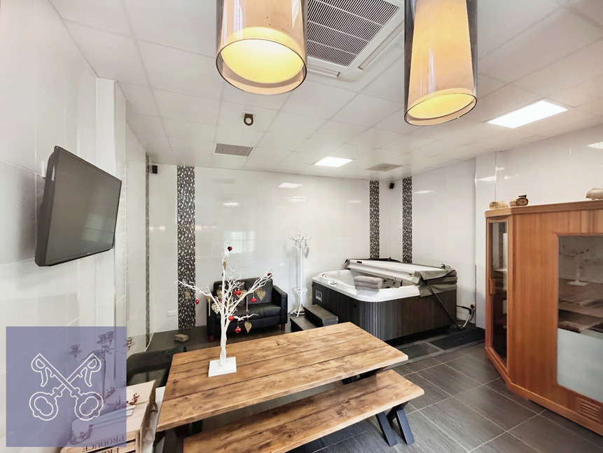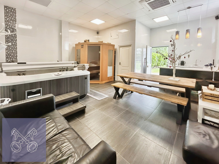 An imaginative conversion, the leisure suite has been transformed into a luxurious and stylish additional space, perfect for entertaining guests. This area features a small kitchen with contemporary cabinets and a stainless steel sink unit. The luxury amenities include a sizable Jacuzzi hot tub and a sauna, with extensive tiling on the walls adding to the opulent feel. Air-conditioning ensures comfort, making this leisure suite an ideal spot for relaxation and entertainment year-round.