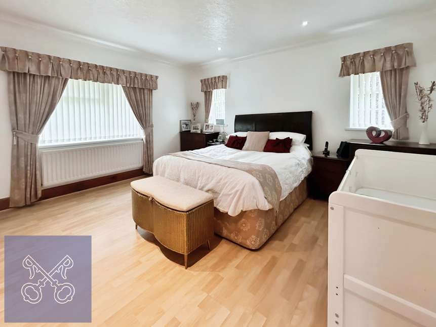 The principal bedroom is the largest of the four, forming part of an impressive suite. Double-glazed windows on two sides allow natural light to pour in, creating a bright and airy atmosphere. Ceiling coving, a laminate floor covering, and a radiator. An archway leads through to the dressing room, enhancing the sense of luxury and space.