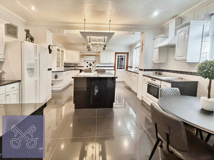 The kitchen/breakfast room serves as the heart of this home, offering abundant natural light through double-glazed windows with garden views. This fabulous space is centred around an original cream-coloured Aga, which dates back to the 1930s and has been regularly serviced, maintained and much loved by the seller. The kitchen features a stunning arrangement of white high-gloss base and wall-mounted cabinets with complementary laminated work surfaces and extensive ceramic tiling. A central island area incorporates a white ceramic sink unit with a mixer tap, positioned under one of the windows. Wall-mounted display cabinets with lighting, a built-in electric hob with an under-counter oven, an extractor hood, and a tiled floor with inset ceiling spotlights complete this impressive room.