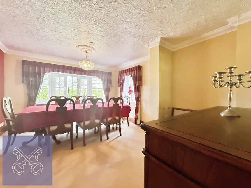 The sizable formal dining room is enhanced by double-glazed windows on two sides that bring in abundant natural light. It's the perfect setting for family gatherings and entertaining, offering a warm and inviting atmosphere. Ceiling coving and a ceiling rose add a touch of sophistication, while a radiator ensures comfort. This elegant room provides an ideal backdrop for memorable meals and celebrations.
