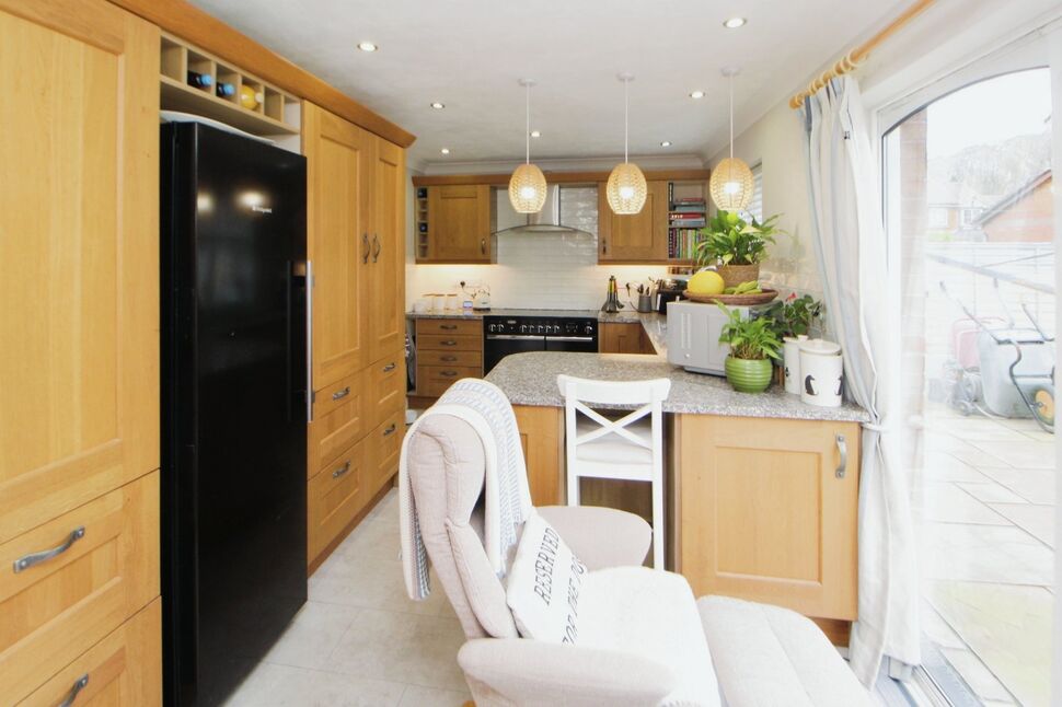 Fitted with a comprehensive range of Oak units including integral dishwasher, Granite work tops, stainless steel sink unit, recess for Range style oven/hob with extractor over, recess for fridge/freezer, under unit lighting, tiled splash back, patio doors to the garden and door to the utility.