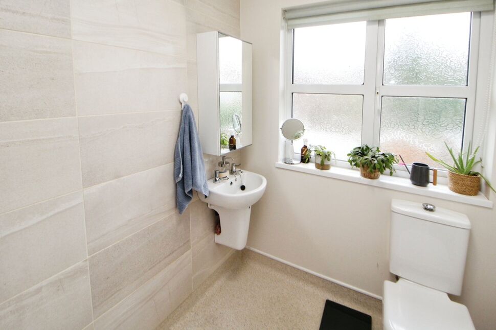 Two piece white suite comprising; hand wash basin and WC. Towel radiator and cupboard housing the boiler.