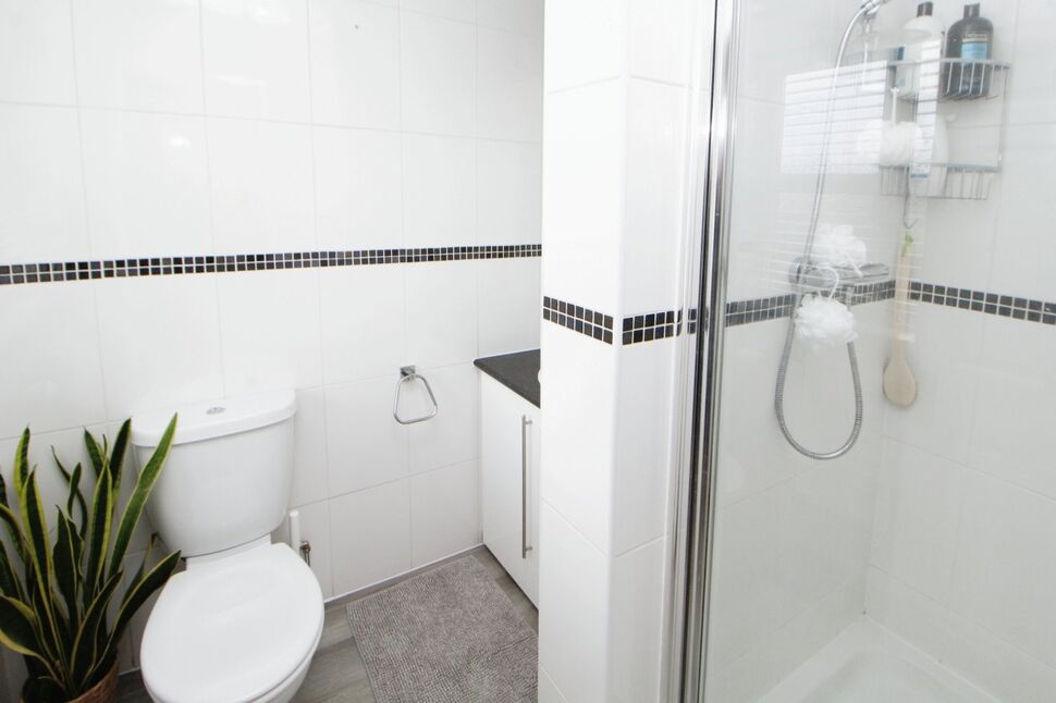 Three piece white suite comprising; tiled shower enclosure, vanity wash hand basin and WC. Tiled walls and towel radiator.
