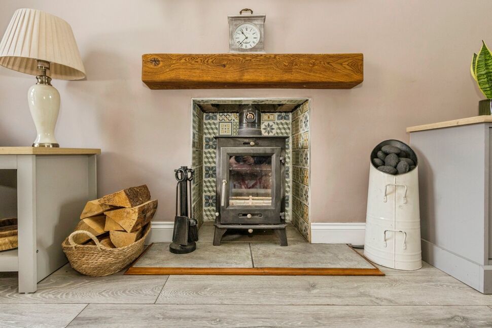 Feature fireplace with stove inset, laminate flooring