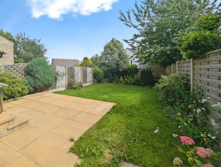 Small lawned area to the front and a drive. To the rear is an enclosed garden with a lawn and a patio area.