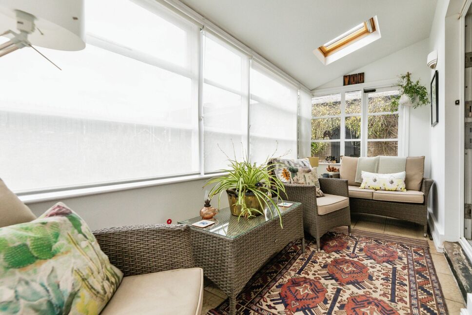 The conservatory is fitted with a tiled floor and rear and side facing windows and side facing door.