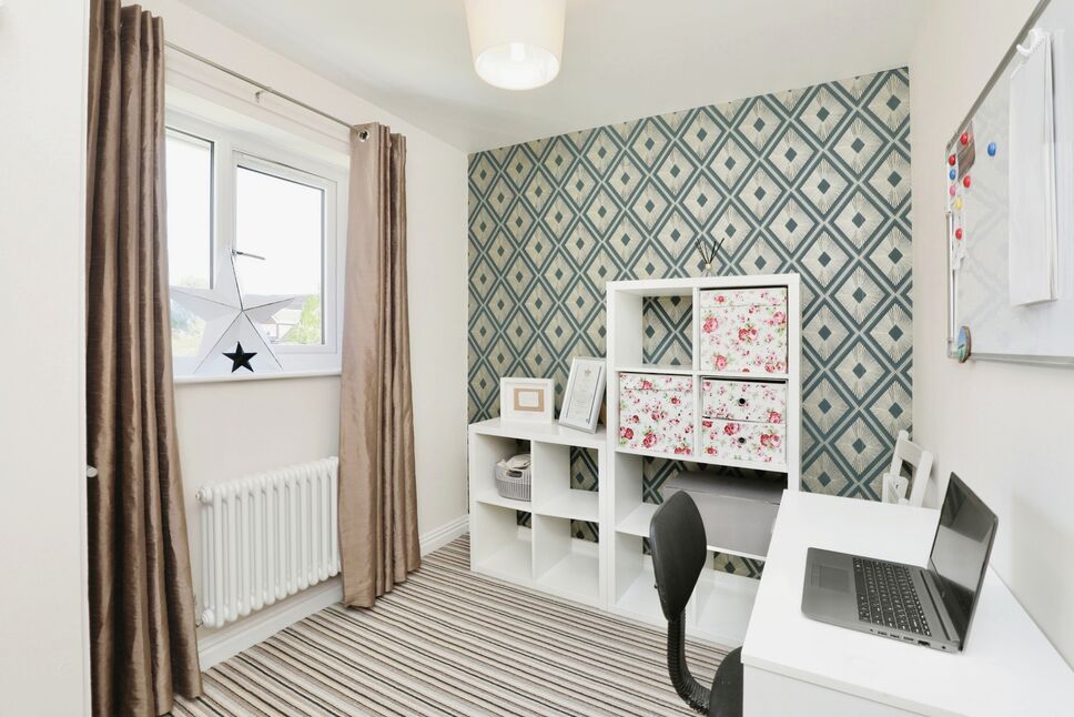 Fitted carpet, spotlights to the ceiling, traditional column central heating radiator, airing cupboard, loft access that is partially boarded and has the boiler inside and side facing double glazed window with complimentary fitted blinds.