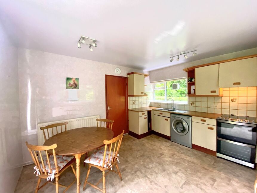 Laminate units and worktops house free standing units, such as a plumbed in washer. Windows to the side and rear provide natural light and patio doors to the side allow access into the garden.