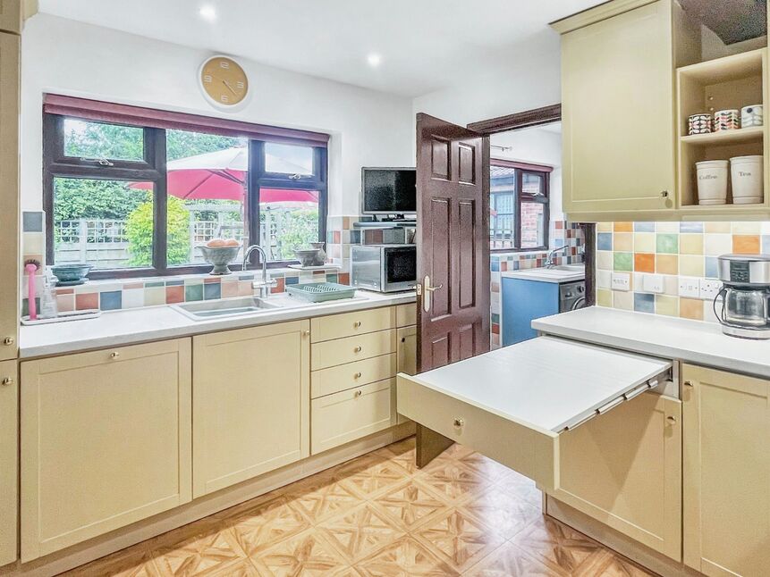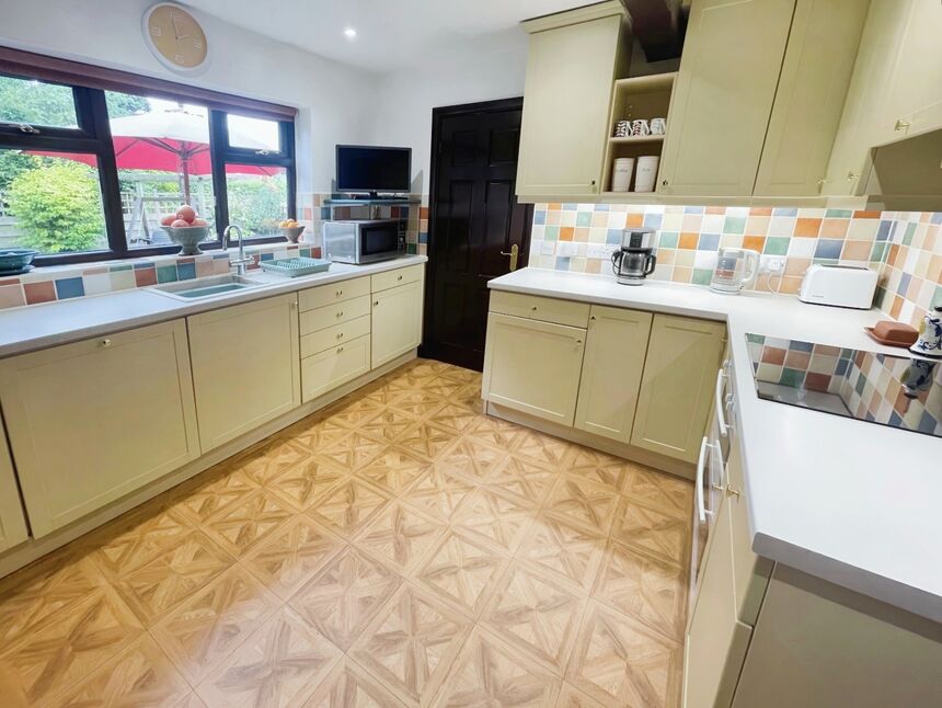 Appointed with a range of matching wall and base units with recently upgraded work surfaces incorporating a sink unit and drainer. Pull out breakfast bar, Neff cooker and induction hob, Siemens Fridge/Freezer and Tv shelf. Double glazed window to the rear aspect with viewing over the rear garden.