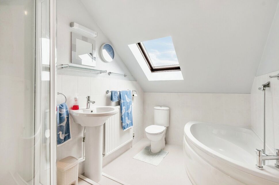 Fitted with a modern four piece suite comprising: corner bath, walk in shower cubical and sky light window. Recent quality vinyl flooring.