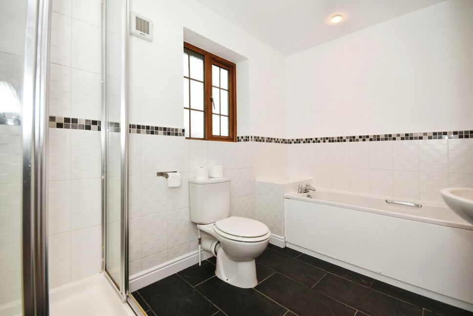 A gernerous family bathroom with panelled bath, separate shower cubicle, wash basin, WC, a window to the rear elevation and a central heating radiator.