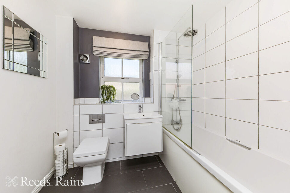 PVCu frosted double glazed window.Three piece white suite comprising of a recessed WC, vanity basin and a panel bath with a thermostatic shower and screen.Extractor fan. Chrome ladder style heated towel rail. Tiled flooring.