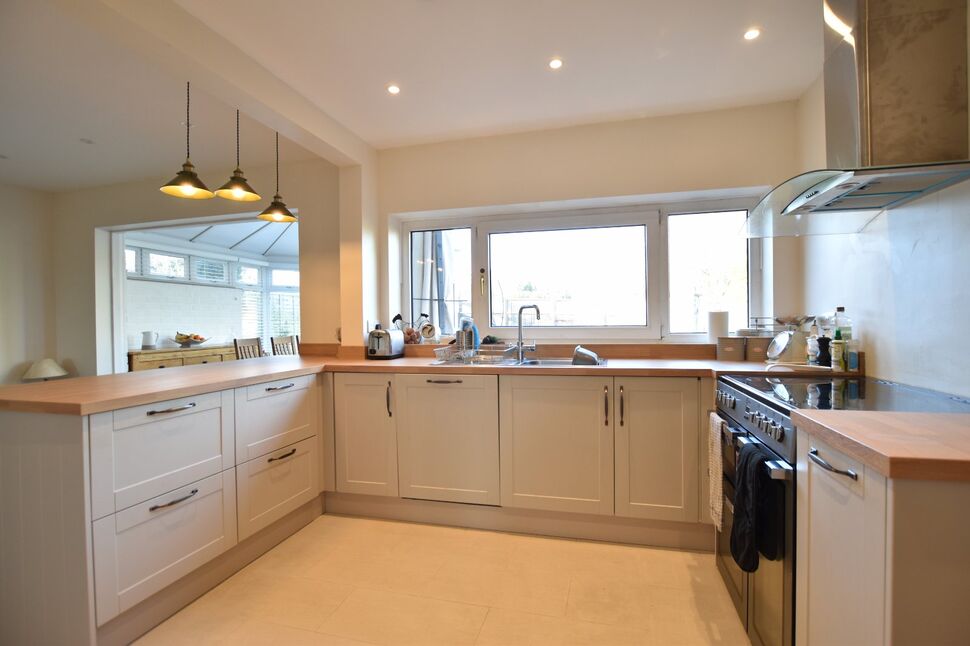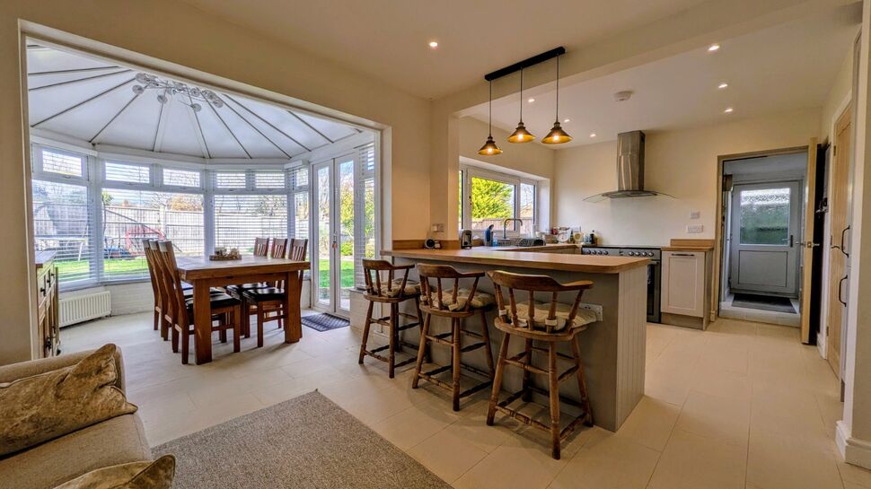 Continuing through you are greeted by the expansive and open-plan kitchen / family room. Showcasing an array of modern fitted 'Shaker' style units under a 'butchers block' effect worktop. The kitchen is complete with; instant boiling water tap, breakfast bar, dishwasher, range, boiling water tap and stainless steel sink which enjoys a pleasing aspect over to the rear garden.