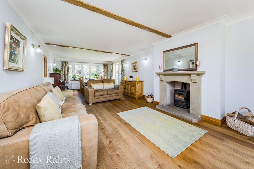 Dual aspect with two PVCu double glazed bow windows.Wood burning stove with a Derbyshire limestone surround and hearth.Decorative beams. Coving. Three radiators. Solid oak flooring.