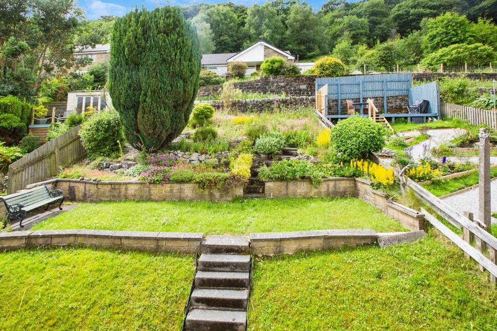 To the front of the house are steps up to the front door and with patio area and access to the sides. The rear has a large tiered garden with patios and lawns all with walled and fenced boundaries.