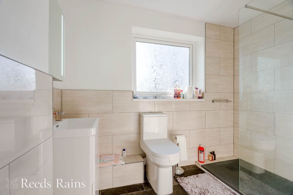 Modern fittings consisting of; walk in shower cubicle, vanity unit housing wash hand basin, WC, Part tiled elevations and tiled floor, radiator.