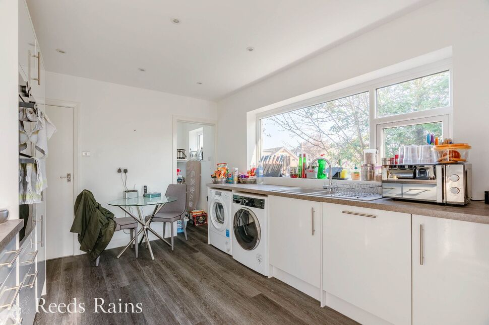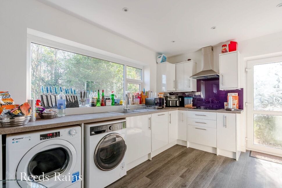 Modern range of white gloss wall and base units with contrasting work surfaces, integrated electric oven and hob with extractor hood, Resin sink and drainer with mixer tap, integrated dishwasher and fridge freezer, space for washing machine and tumble dryer. Upvc double glazed windows, modern radiator, Upvc double glazed door leading out into the garden.