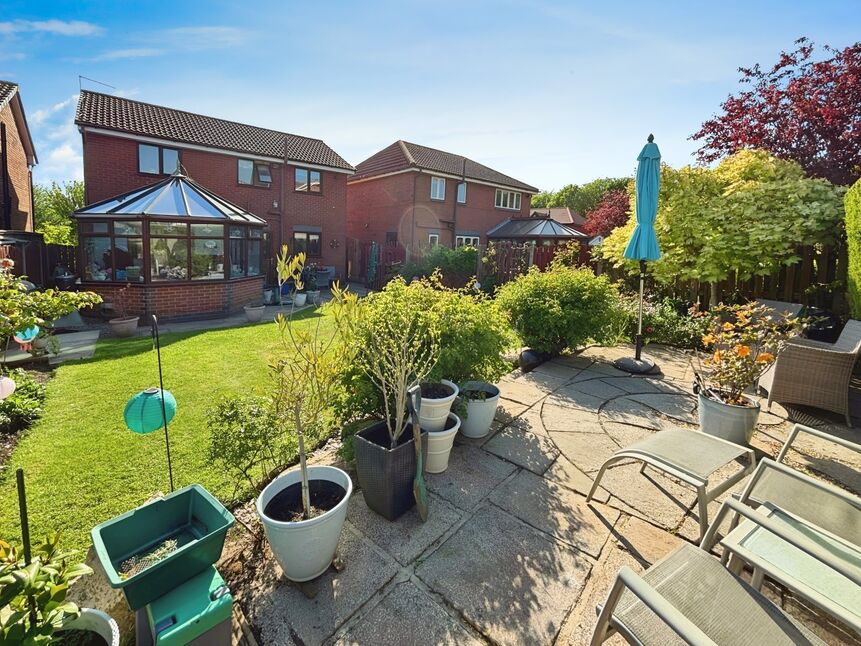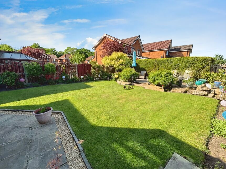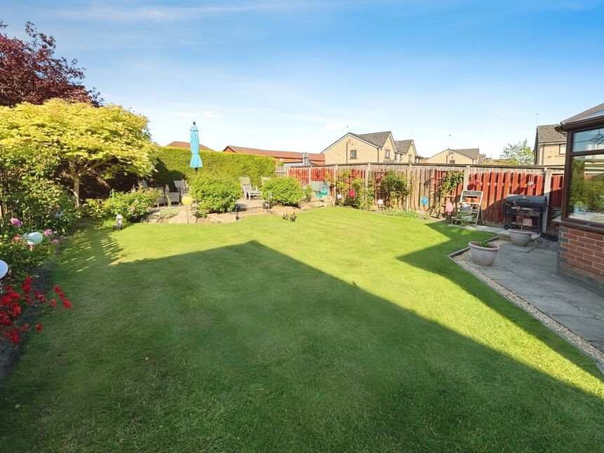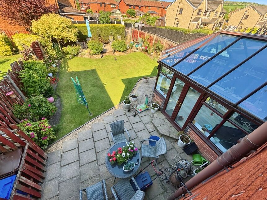 An enclosed rear garden with mature shrub borders. To the front is driveway parking and laid to lawn area.