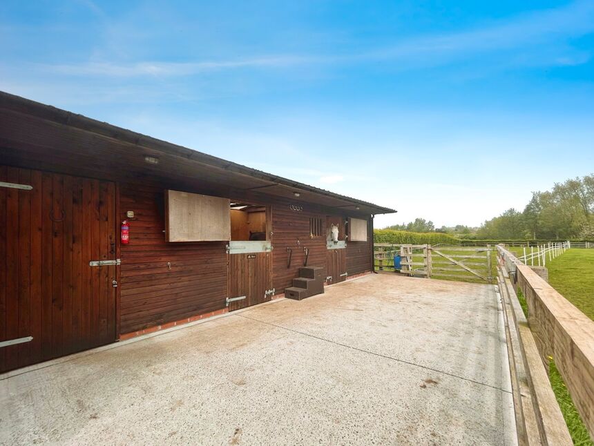 Passing through a sturdy timber gate, the stable yard unveils its enclosed haven, providing access to two well-appointed stables and an adjoining tack room.