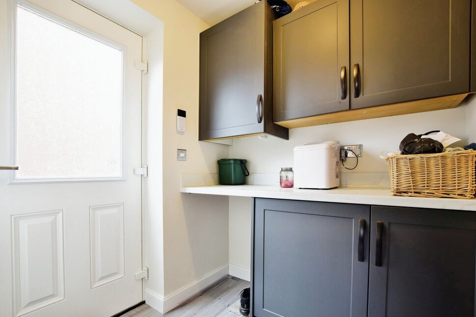 Fitted wit a matching range of units, space for appliances, partially glazed composite door to the side elevation.