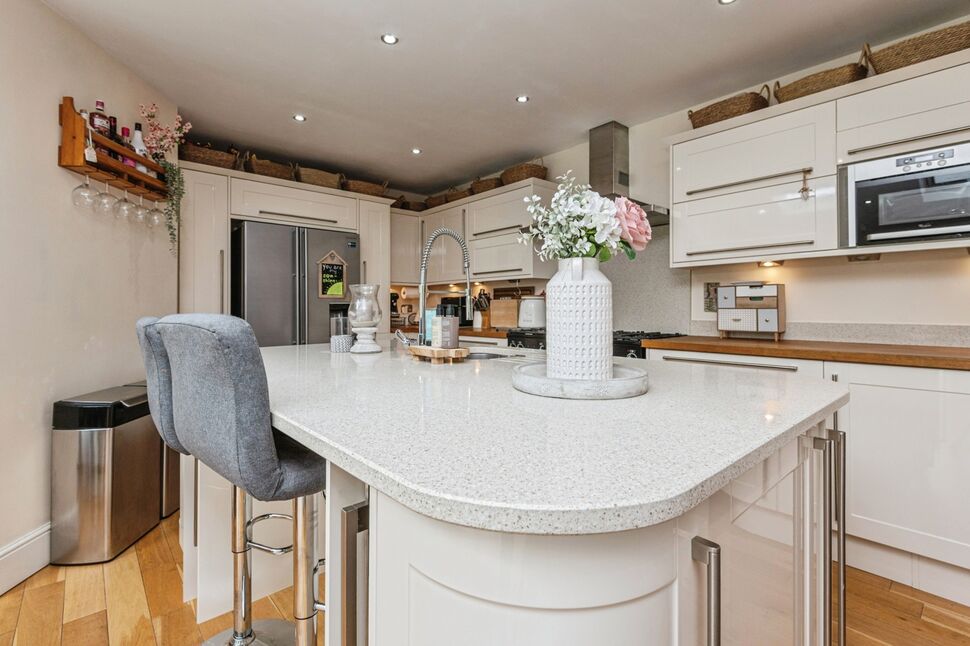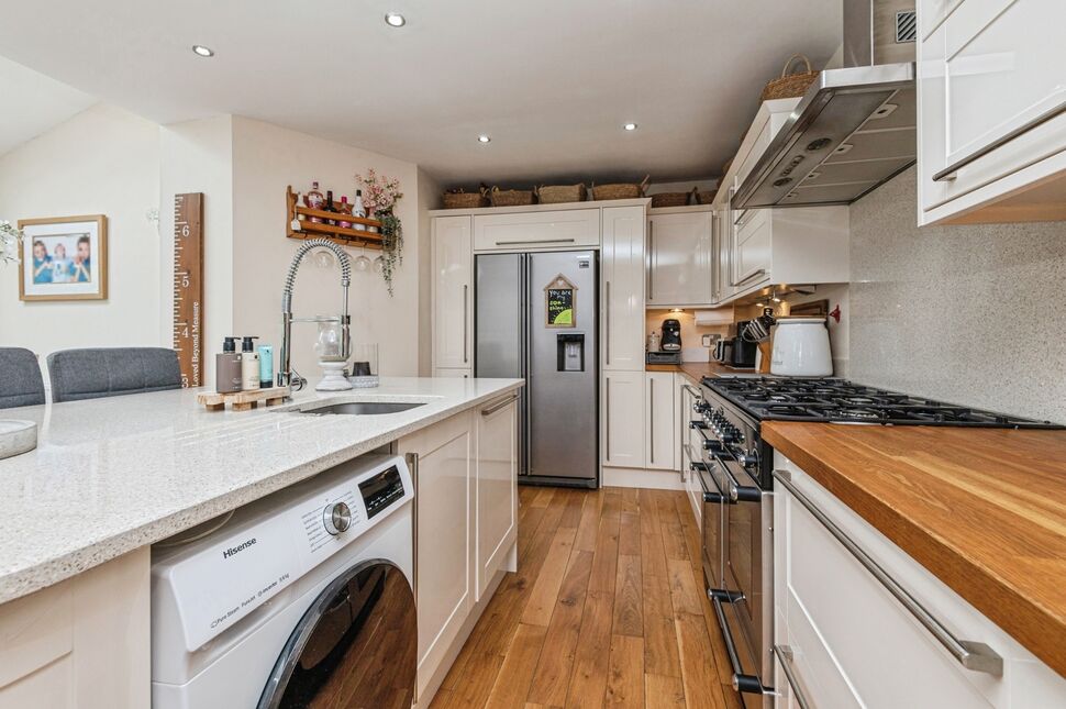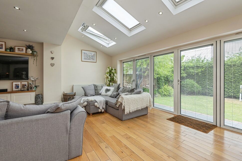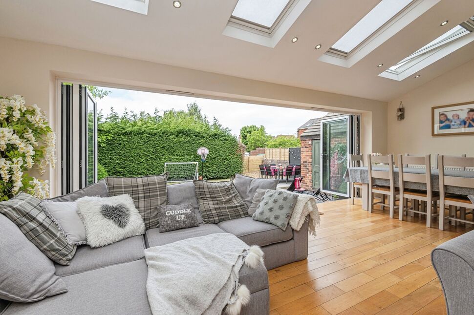 Gorgeous open plan family area which featuring bi-folding doors which run the length of the rear elevation leading onto the rear garden, 4x sky lights. Open plan kitchen area which includes an island and integrated sink and mixer tap attachment, granite worktops, integrated dishwasher, wine cooler storage, a great selection of wall and base units, space for arger oven, integrated microwave, wood flooring, neutrally decorated and 2x gas central heating radiator.