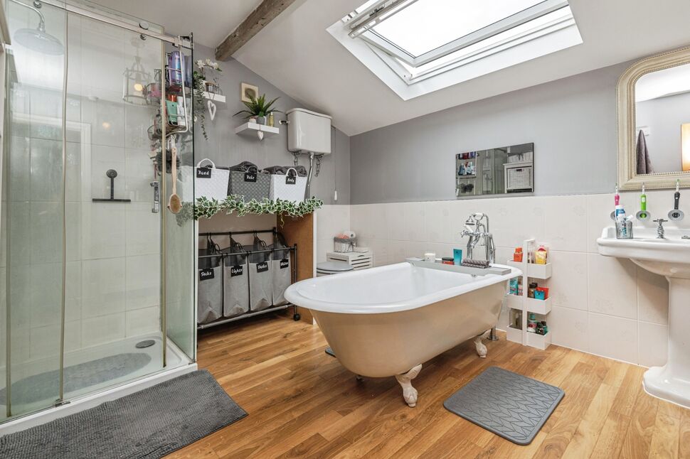 Magnificent four piece family bathroom suite, comprising of a free standing bath, a double shower unit, a traditional high lever style toilet system, Velux window, part tiled to the walls, chrome hand towel style radiator, wood flooring.
