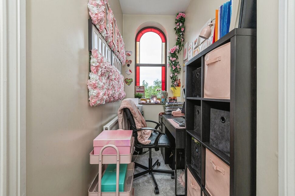 A good sized landing area featuring a oval shaped stain glass window, neutrally decorated with gas central heating radiator and loft access, part of the landing area is currently used as an office.