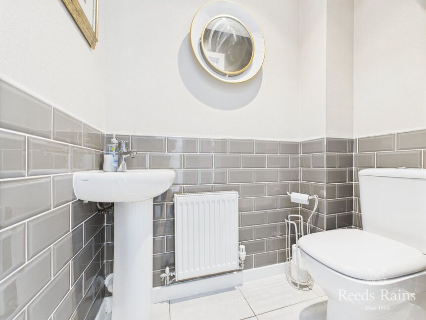 Ideally positioned off the hallway, the cloakroom is stylishly appointed with a two-piece white suite comprising a wash hand basin and low flush WC. Grey brick-style ceramic tiling runs to half height, adding a contemporary edge, while the tiled flooring and radiator complete this practical and attractive space.