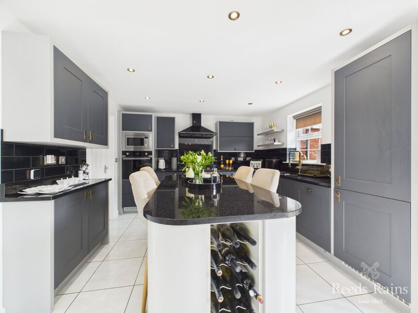 The combined kitchen/family/dining Room spans an impressive 30 feet and is without question the heart of the home. Perfect for everyday living or entertaining on a grand scale, this stunning space has been thoughtfully designed with style and functionality in mind. The kitchen area is fitted with a timeless range of grey shaker-style cabinetry, finished with luxurious solid black granite worktops and sleek brick-effect splashback tiling. Integrated appliances include a gas hob with extractor, eye-level oven and microwave, fridge/freezer, dishwasher, and even a wine cooler. A central island provides additional storage and casual seating beneath a polished granite surface. Double glazed French doors open directly to the rear garden, enhancing the sense of space and connection with the outdoors. A continuous tiled floor runs throughout, unifying the space, with ample room for both a family dining area and relaxed seating.