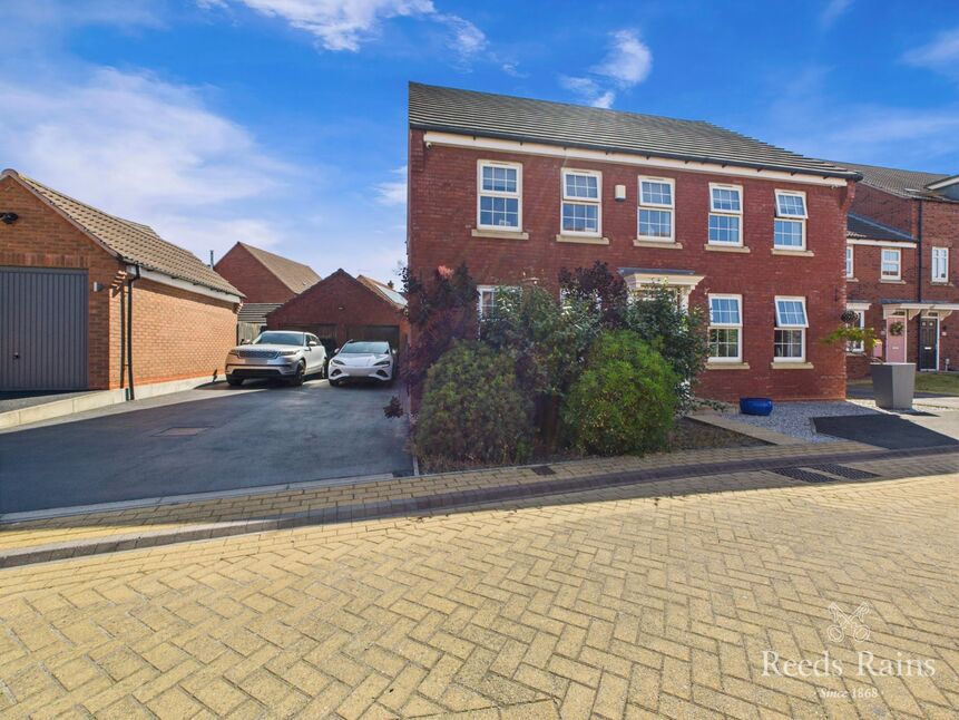 Externally, the property continues to impress. To the front, it enjoys a prime position near the head of a quiet cul-de-sac, with neat landscaping and a central pathway. A double width private driveway offers off-street parking for multiple vehicles and leads to a matching detached double garage with power and lighting.