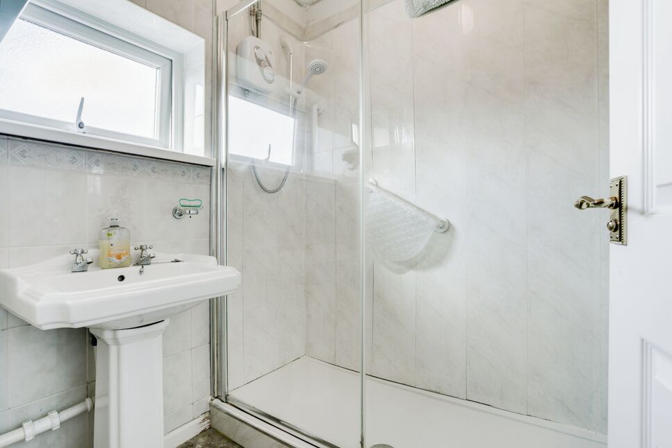 Fully tiled suite briefly comprising of walk in shower unit, wash hand basin and uPVC double glazed frosted window.