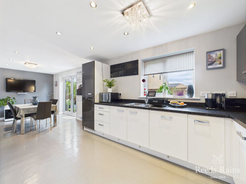 The sitting room, positioned at the front of the house, is a relaxing and comfortable space with a bright and airy atmosphere. Double doors open into a stunning kitchen and dining area at the rear, creating an effortless flow that’s ideal for modern family life and entertaining alike. This space is both practical and stylish, featuring a clean, contemporary design with high-gloss two-tone cabinetry, quality integrated appliances, and ample room for a large dining table. A separate utility room provides additional convenience.