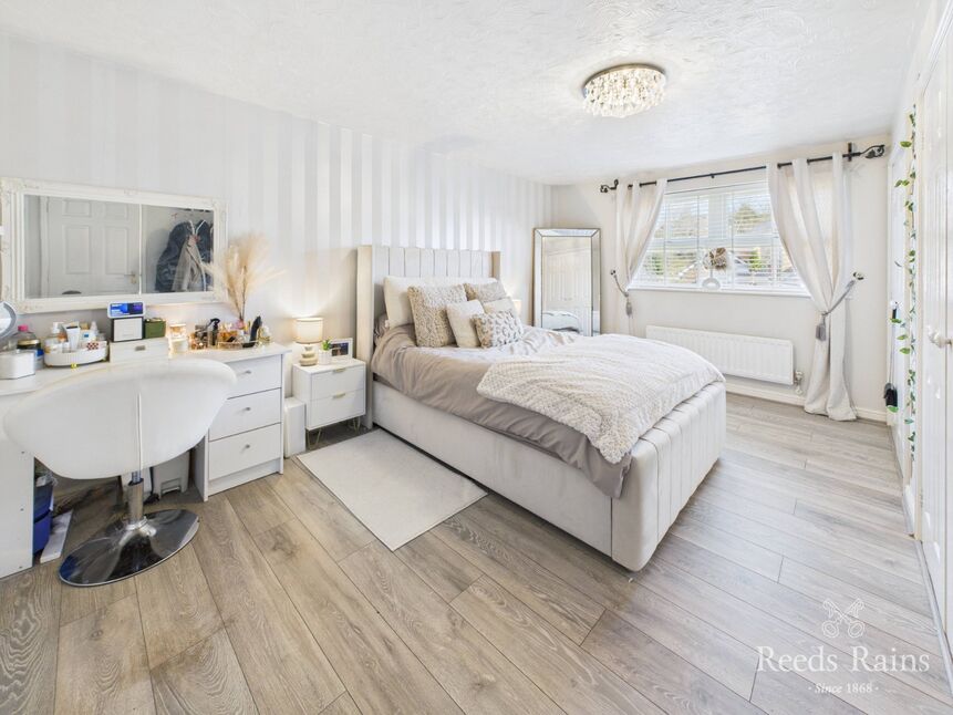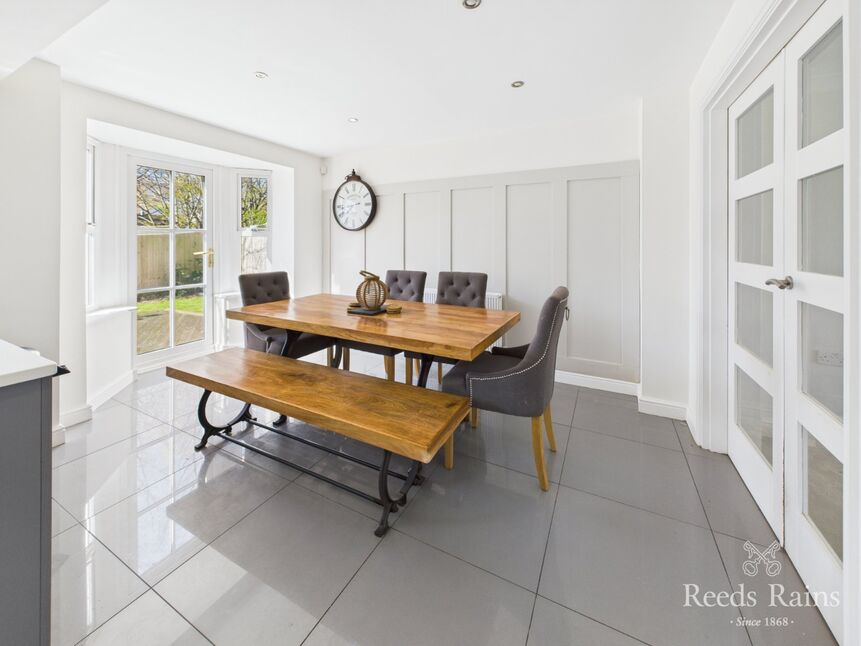 Situated over three floors, the ground floor features a welcoming entrance hallway, a versatile study currently used as a salon, and a formal living room with double doors leading to the open plan kitchen/diner. The kitchen boasts built-in appliances and shaker style units, creating a perfect space for entertaining. A small inner hallway leads to a downstairs WC, courtesy door to the garage, and an extended second living room with skylights, bi-folding doors to the garden, and a cosy log burning stove. The first floor comprises four bedrooms and a family bathroom, with one bedroom featuring built-in wardrobes and an ensuite bathroom. The top floor houses a generously sized master bedroom with a modern ensuite shower room and walk-in dressing room. Outside, there is a large block paved driveway, a front lawn, and a double garage providing ample parking and storage space. The rear garden is a true highlight, featuring a generous lawn and raised decking area - an ideal spot for soaking up the summer sun.