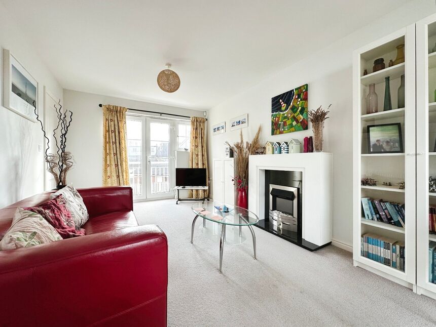 Carpeted, double glazed doors to front leading onto balcony with space for chairs. Mezzanine with double glazed full height windows to rear with views towards Rye, feature electric fire, radiator.