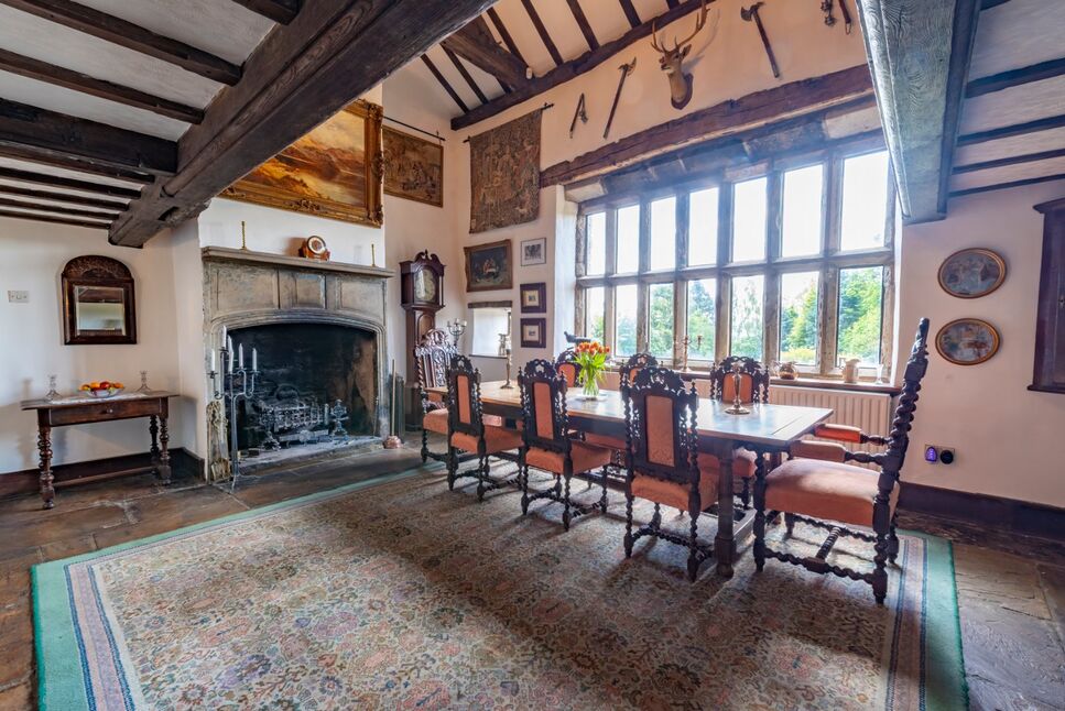 The spectacular heart of the home, boasting a king post and angle strut truss over a smoke bay, indicative of medieval construction techniques. A prominent stone fireplace with a moulded surround and basket arch lintel serves as a focal point. The hall's open timber-framed roof, minstrel's gallery and mullioned windows with hood moulds reflect its historical significance. Ideal for entertaining or tranquil family living.