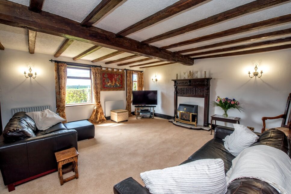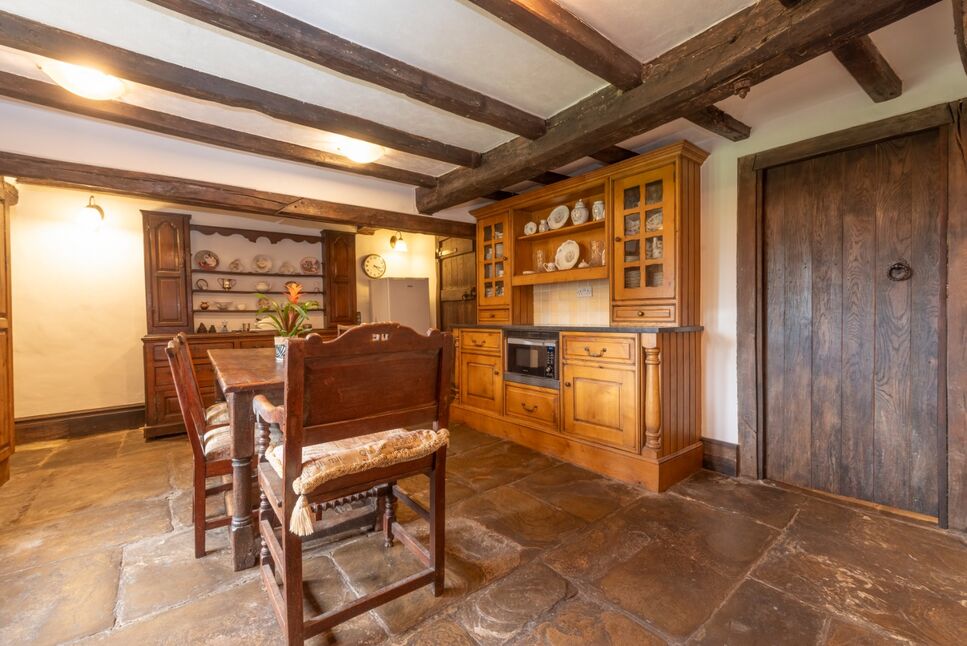Adjacent to the Great Hall, the sitting room offers a cozy retreat. Exposed stone walls and original timber beams create a warm ambiance, complemented by a traditional fireplace.