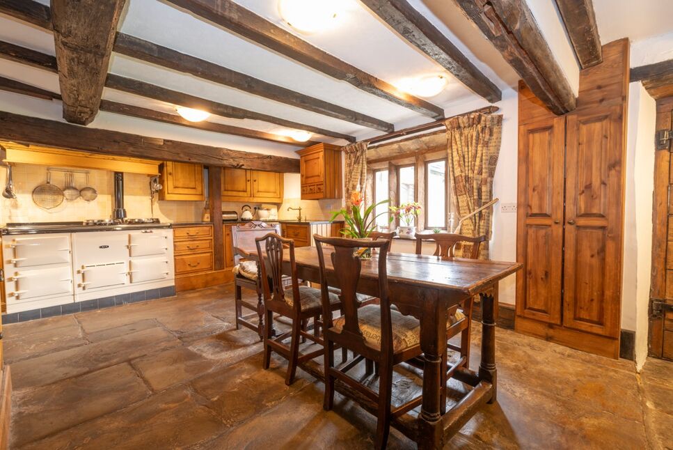 Fitted with farmhouse cabinetry and a traditional four oven Aga in classic cream, this spacious kitchen overlooks the gardens. Having stone flagged flooring, stone mullioned windows and exposed beamed ceilings.