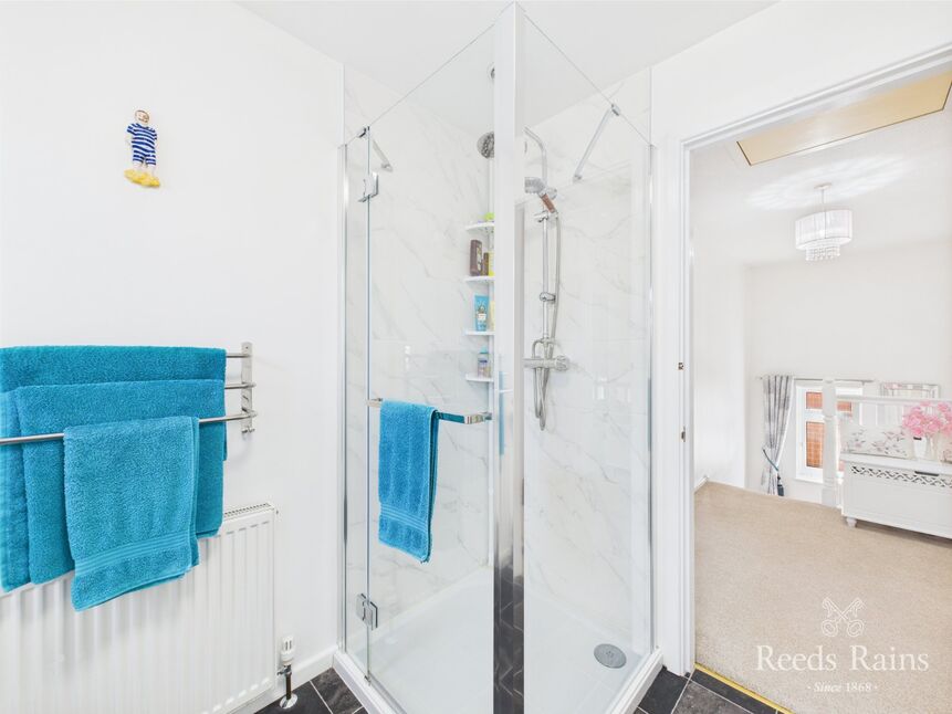 Stylishly finished with a four-piece suite comprising a panelled bath, walk-in shower enclosure with contemporary fittings, low-flush WC, and a wash hand basin set into a high-gloss vanity unit. Twin side-facing double-glazed windows provide light and ventilation. Finished with tiled splashbacks and a radiator.