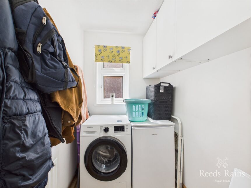 Located off the entrance hall, this handy utility space includes a side-facing double-glazed window, laminate flooring, and radiator, ideal for laundry and storage needs.