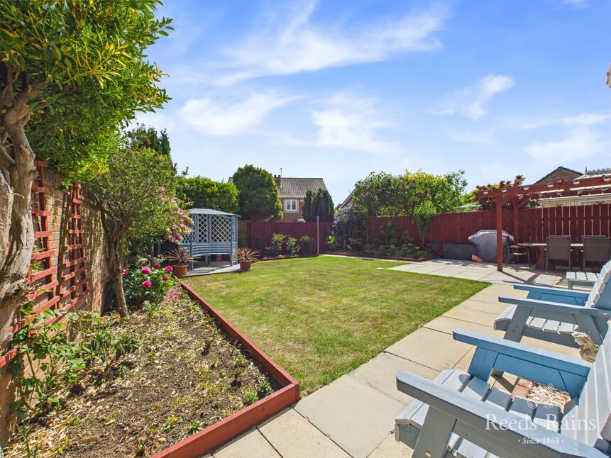 Outside, the appeal continues. A private driveway offers off-street parking and leads to a detached brick-built garage. The pebbled front garden adds additional parking space. To the rear, a stunning south-facing garden awaits — beautifully maintained and designed for year-round enjoyment with a lawn, paved seating area, and a charming pergola that creates a perfect backdrop for summer evenings.