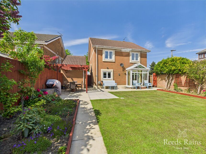 - Outside, the home features a private driveway, detached garage, and a beautifully landscaped south-facing rear garden with lawn, patio, and pergola — ideal for relaxing or entertaining.