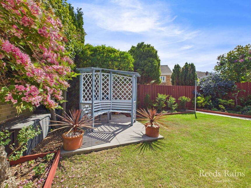 The south-facing rear garden is a true highlight—a beautifully maintained and private outdoor retreat. Mainly laid to lawn with mature planting beds, it also features a patio terrace perfect for relaxing or dining al fresco, and a charming timber pergola for added character. A gated side area offers convenient additional storage.