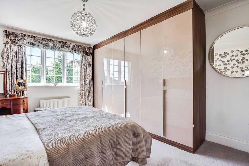 Double bedroom with fitted wardrobes, carpeted floor, gas central heating radiator and uPVC double glazed window to the rear elevation.