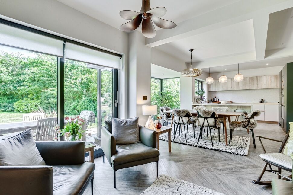 Incredibly spacious and modern open plan area to the rear of the home. The kitchen section is fitted with wall and base units, quartz worktops and integrated 1 1/2 sink/drainer. With integrated appliances such as; double AEG oven, microwave oven, fridge, freezer and wine fridge. This room has multiple gas central heating radiators, multiple uPVC double glazed windows and a set of French doors leading out into the rear garden.